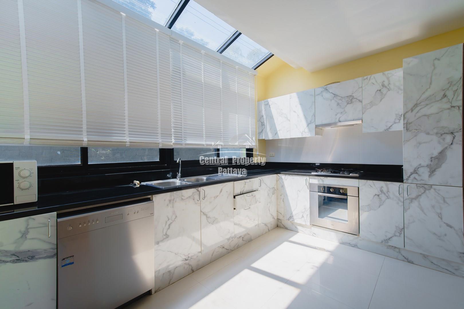 The villa features an open and airy layout enhanced by large glass windows that fill the space with natural light. The modern kitchen is fitted with marble-style countertops, built-in appliances, and a bright skylight design, making it ideal for both everyday cooking and entertaining. The spacious living and dining areas open directly onto the private pool and terrace, offering seamless indoor-outdoor living.